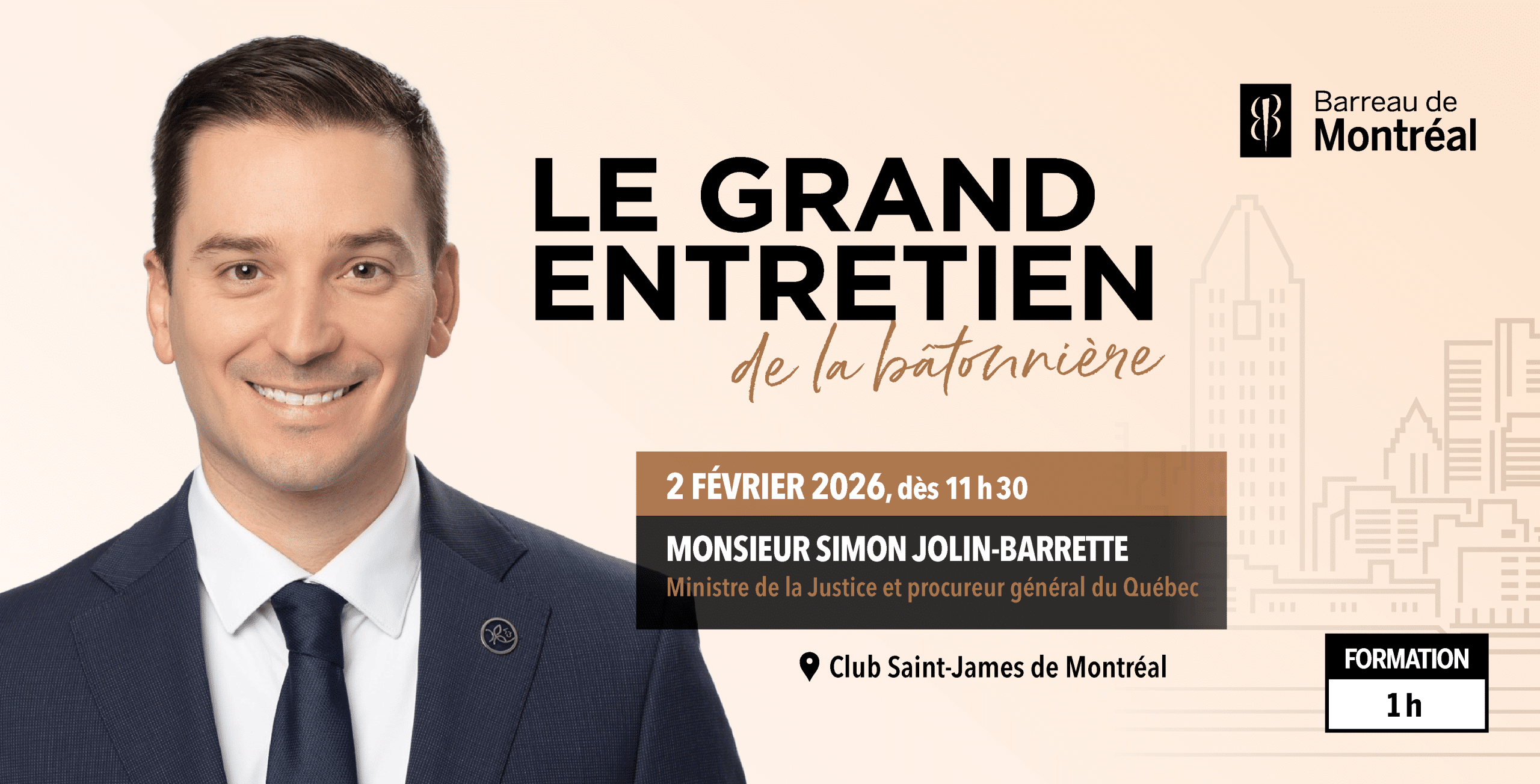 Soyez des nôtres le 2 février prochain alors que la bâtonnière de Montréal s’entretiendra avec le ministre de la Justice et procureur général du Québec, Monsieur Simon Jolin-Barrette.