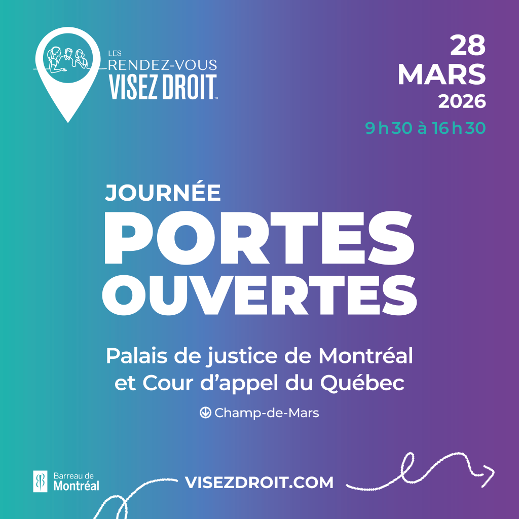 Dans le cadre des Rendez-vous VISEZ DROIT, le Barreau de Montréal invite le grand public à participer à un événement unique qui offre l’occasion d’entrer dans les coulisses des institutions judiciaires : la 2e édition de la journée portes ouvertes VISEZ DROIT au Palais de justice de Montréal et à la Cour d’appel du Québec, le samedi 28 mars prochain.
