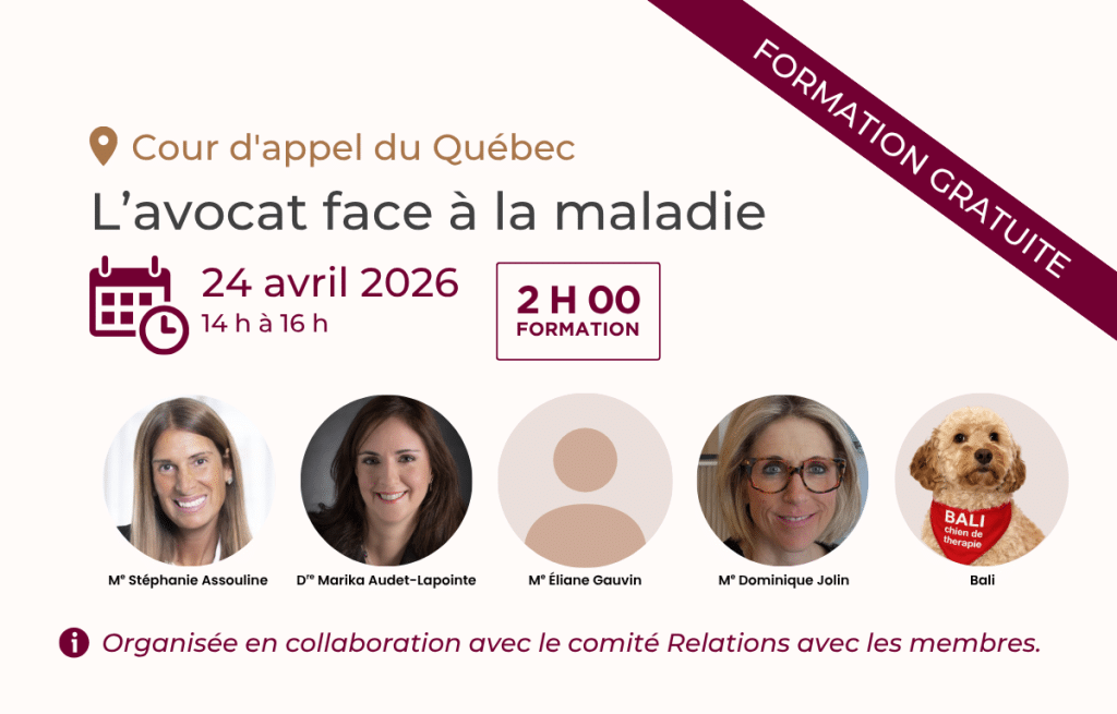 Cette formation vise à mieux comprendre les défis vécus par les avocats touchés par une maladie et à outiller la profession afin de créer des environnements plus humains, plus soutenants et plus sécuritaires.